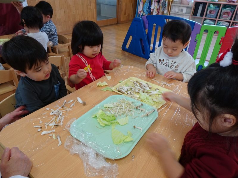 給食の先生と一緒にキャベツやしめじ、にんじん、キャベツなど様々な野菜を使ってスープを作りました。子ども達は知っている野菜の名前を言いながら握り、細かくちぎっていました。とても美味しいスープが出来ました。完成後は、喜んで食べ、お代わりを求める姿もありました♪