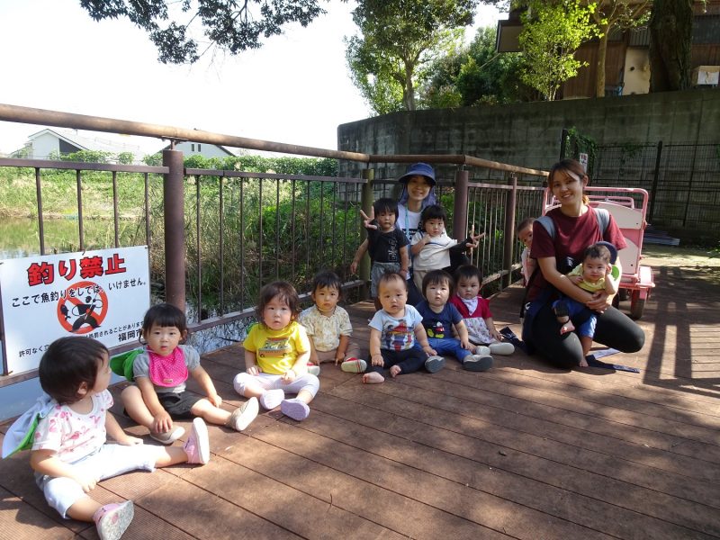 園外散歩では老司中公園に行きました!歩けるようになった子どもたちは先生と手をつないで