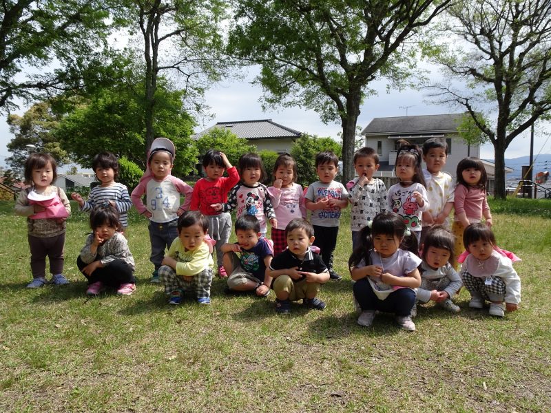 老司中公園へお散歩に行きました。保育者と手を繋いだり、誘導ロープを握って上手に歩くことが出来ました。公園では、シャボン玉を追いかけたり、シロツメ草を摘んだ英り春の自然を満喫しました。